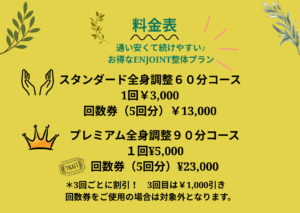 いつもENJOINT整体をご利用いただきありがとうございます。この度、お客様のお声をもとに整体メニューをリニューアルしました。<新メニューはこちらです。>◇スタンダード全身調整60分コース ・1回¥3